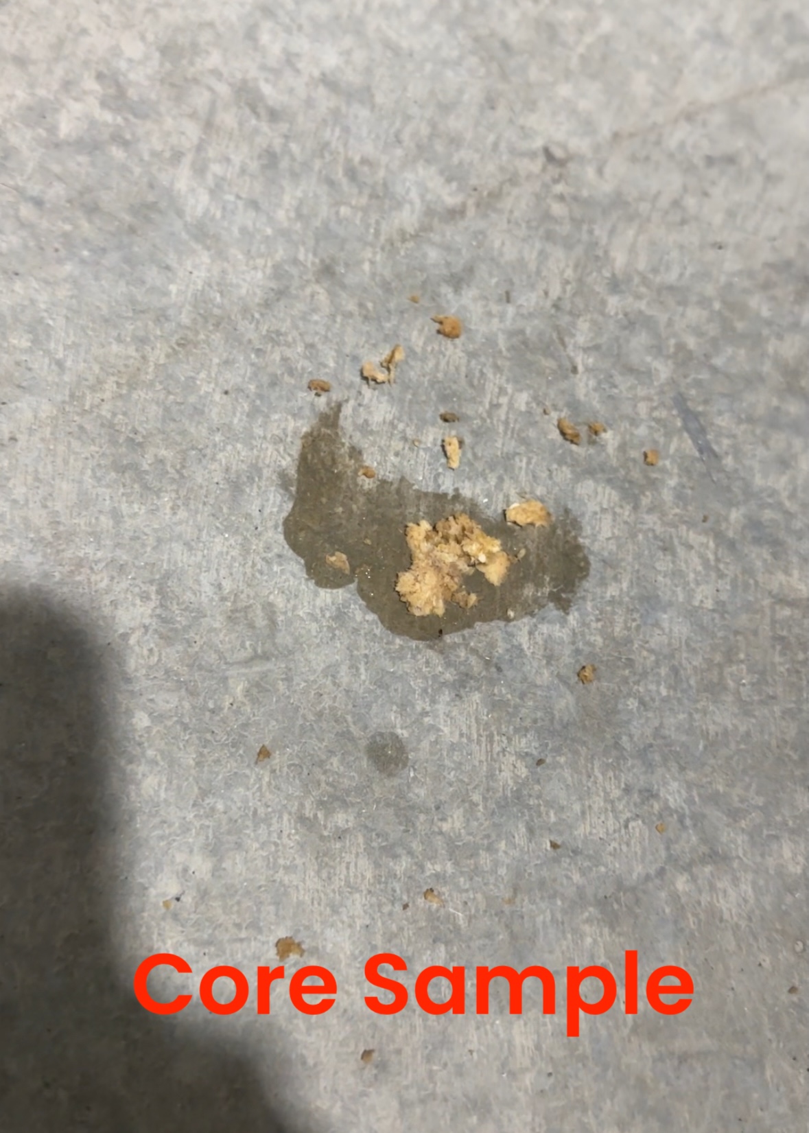 Use a drill with a small 3/16″ bit to take your core samples. Once you drill into the affected area, inspect the material on the drill flutes. If it appears darker, it indicates moisture. If the coring is blonde, press it onto a paper towel to check whether any moisture is absorbed.